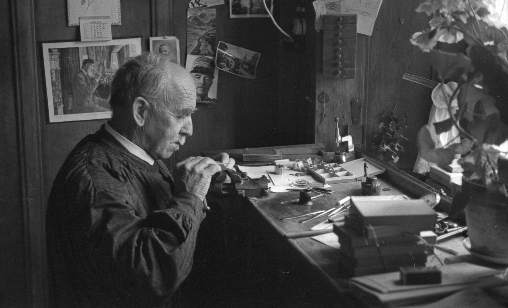 Paysan horloger à domicile, une profession en voie de disparition dans le courant du XXe siècle (La Sagne, avril 1946). Sous l’œil du général Guisan, héros – faut-il le rappeler – de toute une génération dans la Suisse de l’après-guerre, cet homme à son établi reproduit le geste du «Vieil horloger» (1890) visible à l’arrière-plan dans la fameuse peinture du Chaux-de-Fonnier Edouard Kaiser.