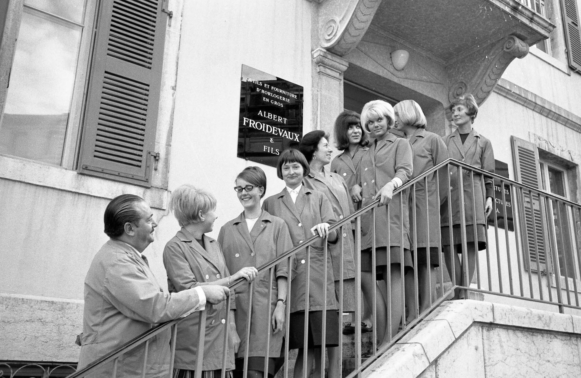 Devant l’entreprise de fournitures horlogères Albert Froidevaux & Fils SA, rue de la Promenade 2 à La Chaux-de-Fonds. A la fin du XIXe siècle, l’industrie horlogère suisse employait environ un tiers de femmes dans ses effectifs. Ce taux augmentera jusqu’à représenter la moitié de la main-d’œuvre horlogère à la fin des années 1960. Il est aujourd’hui de 45%. Toutefois, si la branche est paritaire, elle n’est pas mixte: les métiers masculins et féminins restent souvent spécifiques et définis.