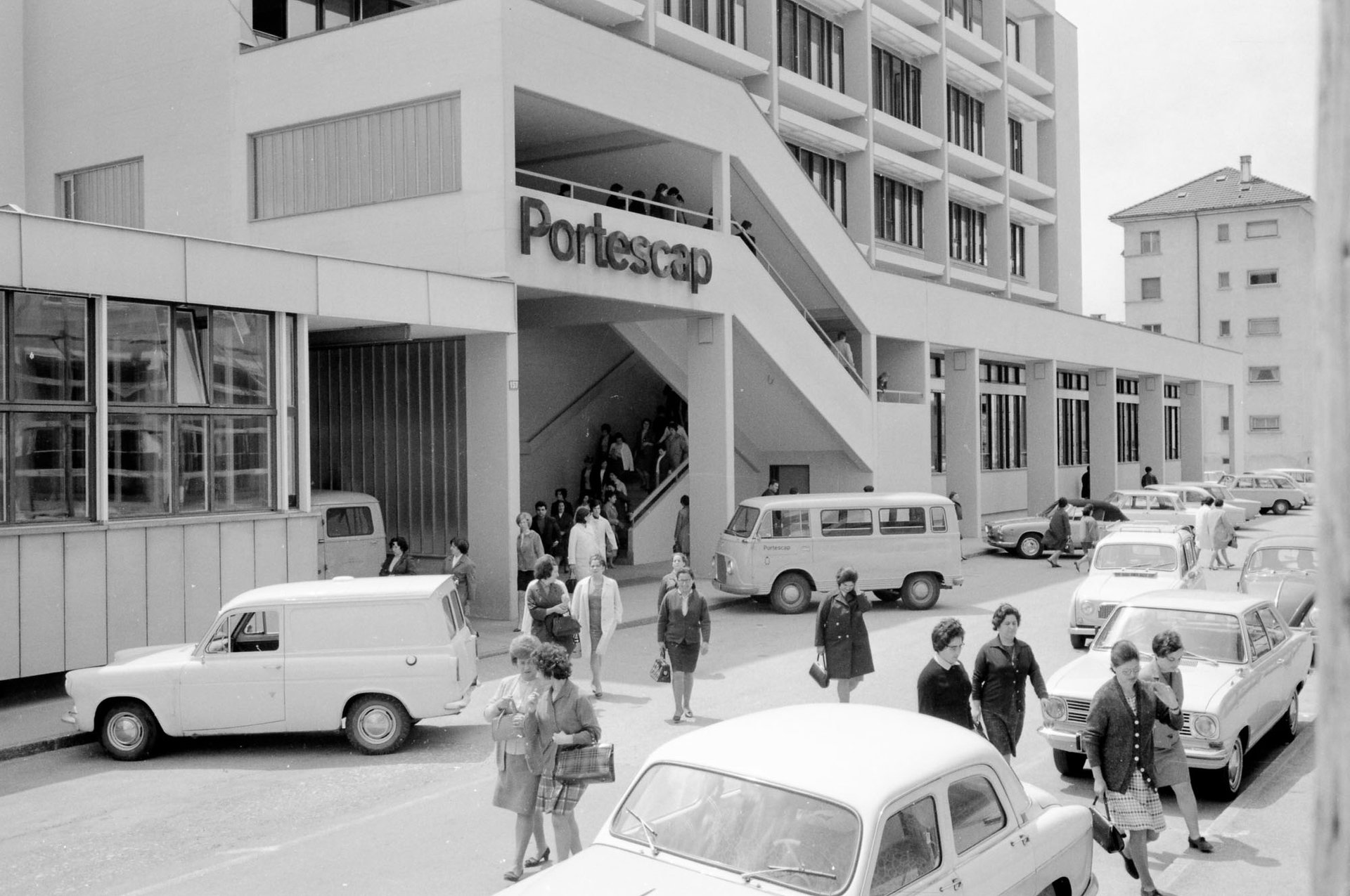 Sortie d’usine chez Portescap (La Chaux-de-Fonds, 1968). La société Porte-échappement Universel SA, plus connue sous le nom de Portescap, est fondée en 1931 par l’industriel chaux-de-fonnier Georges Braunschweig et son condisciple Frédéric Marti. L’entreprise développe son célèbre amortisseur de chocs Incabloc qui deviendra progressivement un composant incontournable de la plupart des montres à ancre. Dans les années 1960, Portescap est, avec près de 1300 employés, le plus important employeur de La Chaux-de-Fonds. Cette sortie d’usine montre le nouveau bâtiment de l’entreprise, rue Jardinière, inauguré en 1965.