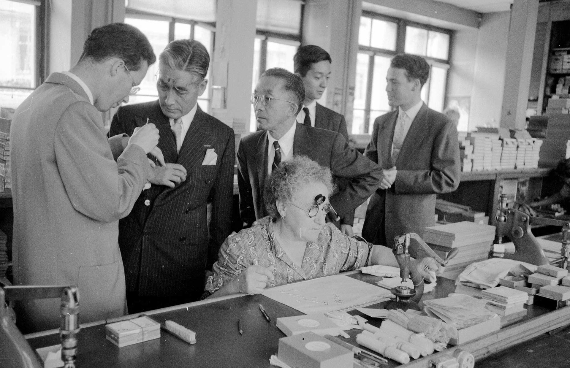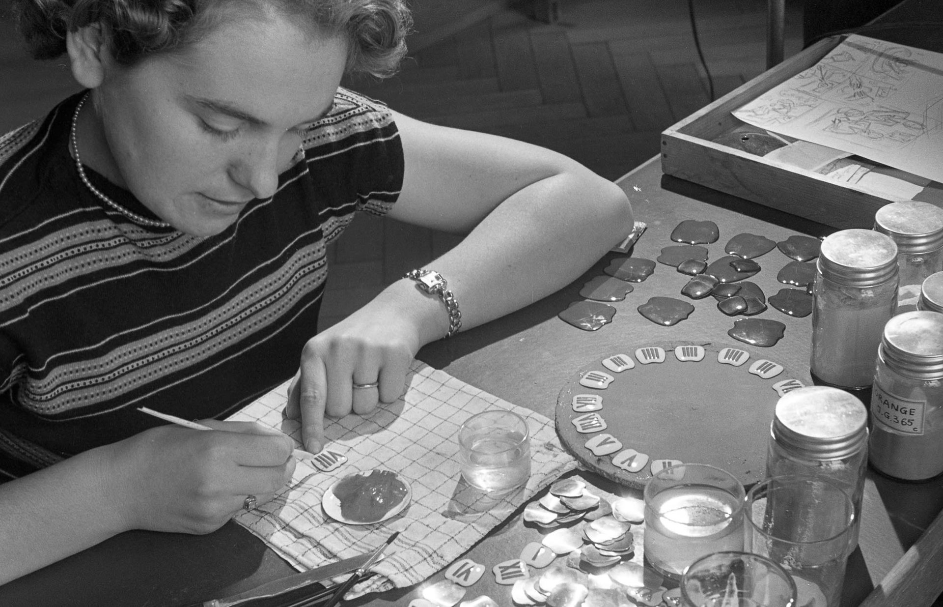 Opération d’application d’émail coloré sur appliques, l’une des étapes de la fabrication du cadran, ici un cadran d’horloge dans les ateliers Ernest Borel. En 1953, l’entreprise était basée dans son nouveau bâtiment situé à la Maladière, à Neuchâtel. Ce bâtiment moderne avait été construit en 1947 et symbolisait l’essor et l’expansion d’Ernest Borel au lendemain de la guerre.