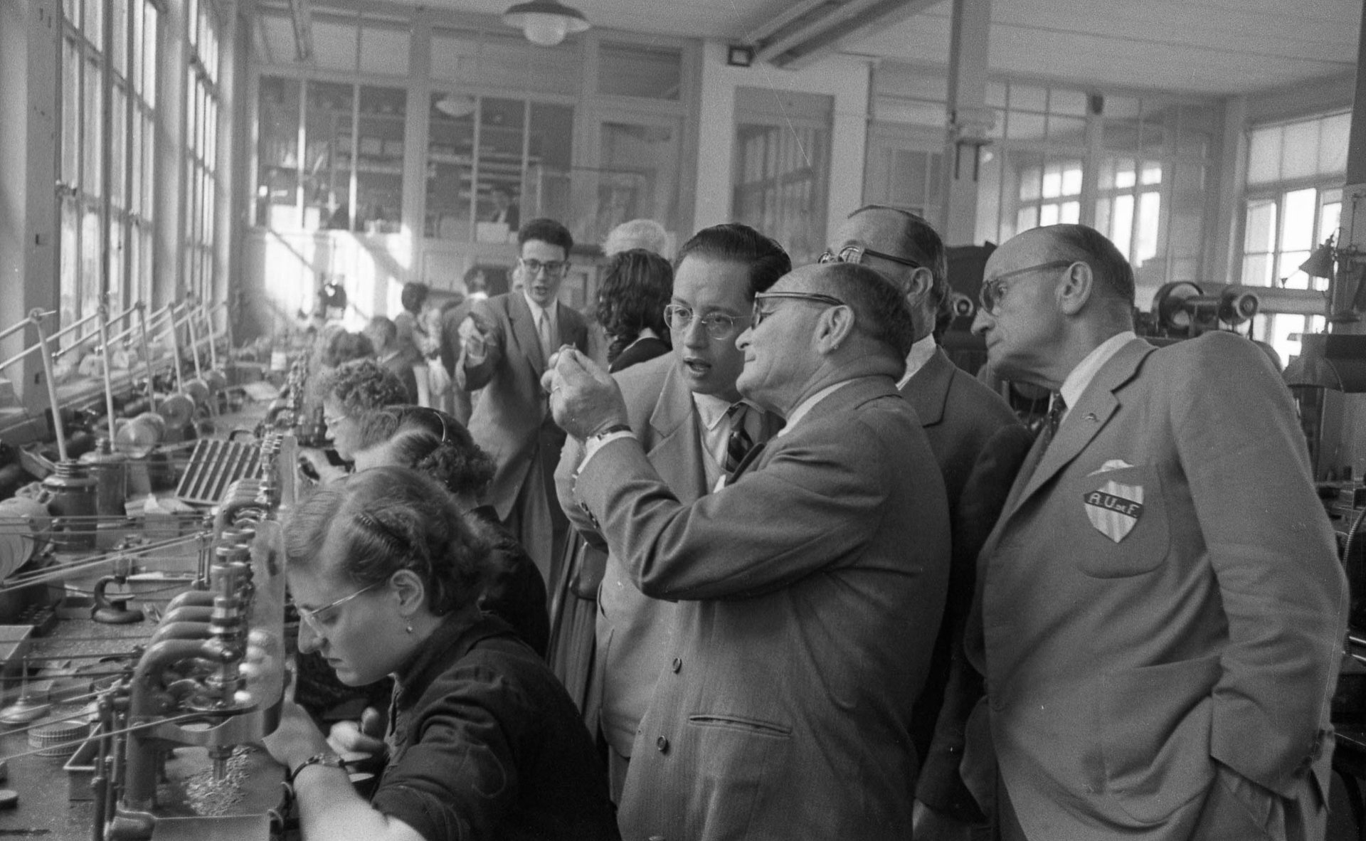 Visite d’entreprise, ateliers Movado (La Chaux-de-Fonds, 1957). Il n’est pas rare que l’industrie horlogère ait encouragé les travailleurs à poursuivre leur activité en usine jusqu’à un âge avancé. Mise en place en 1948, l’assurance vieillesse ne permettait pas encore aux ouvrières et ouvriers suisses retraités dans les années 1950 de toucher des rentes suffisamment confortables pour en vivre. De plus, les employeurs sont attachés à cette main-d’œuvre rodée.
