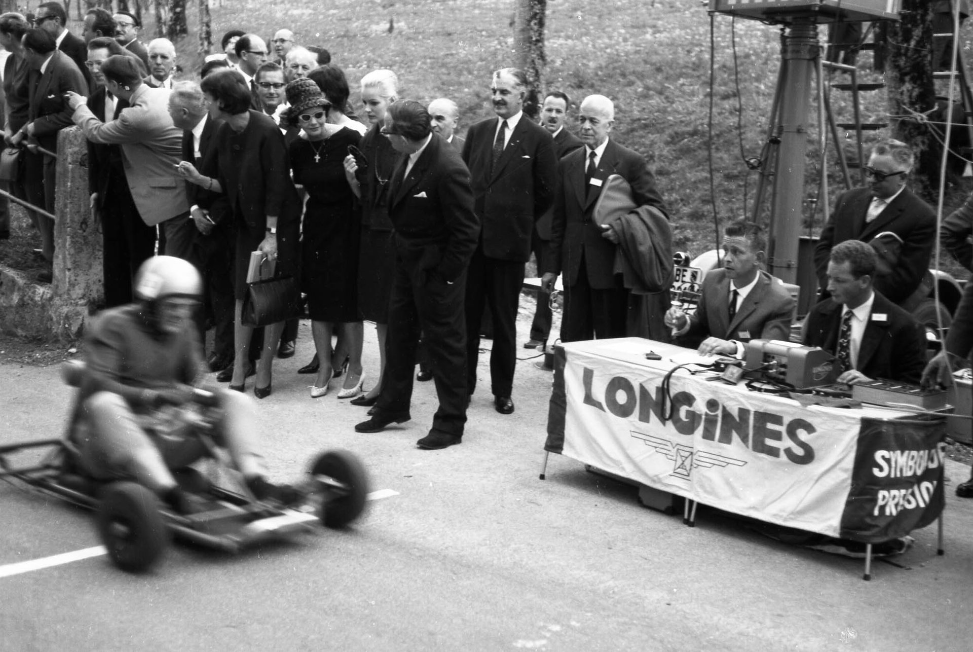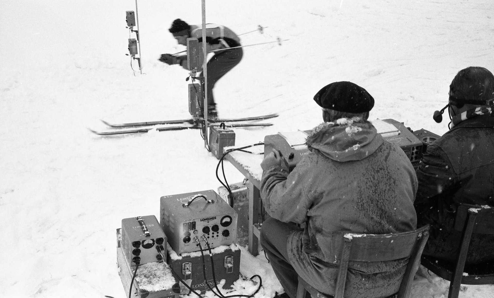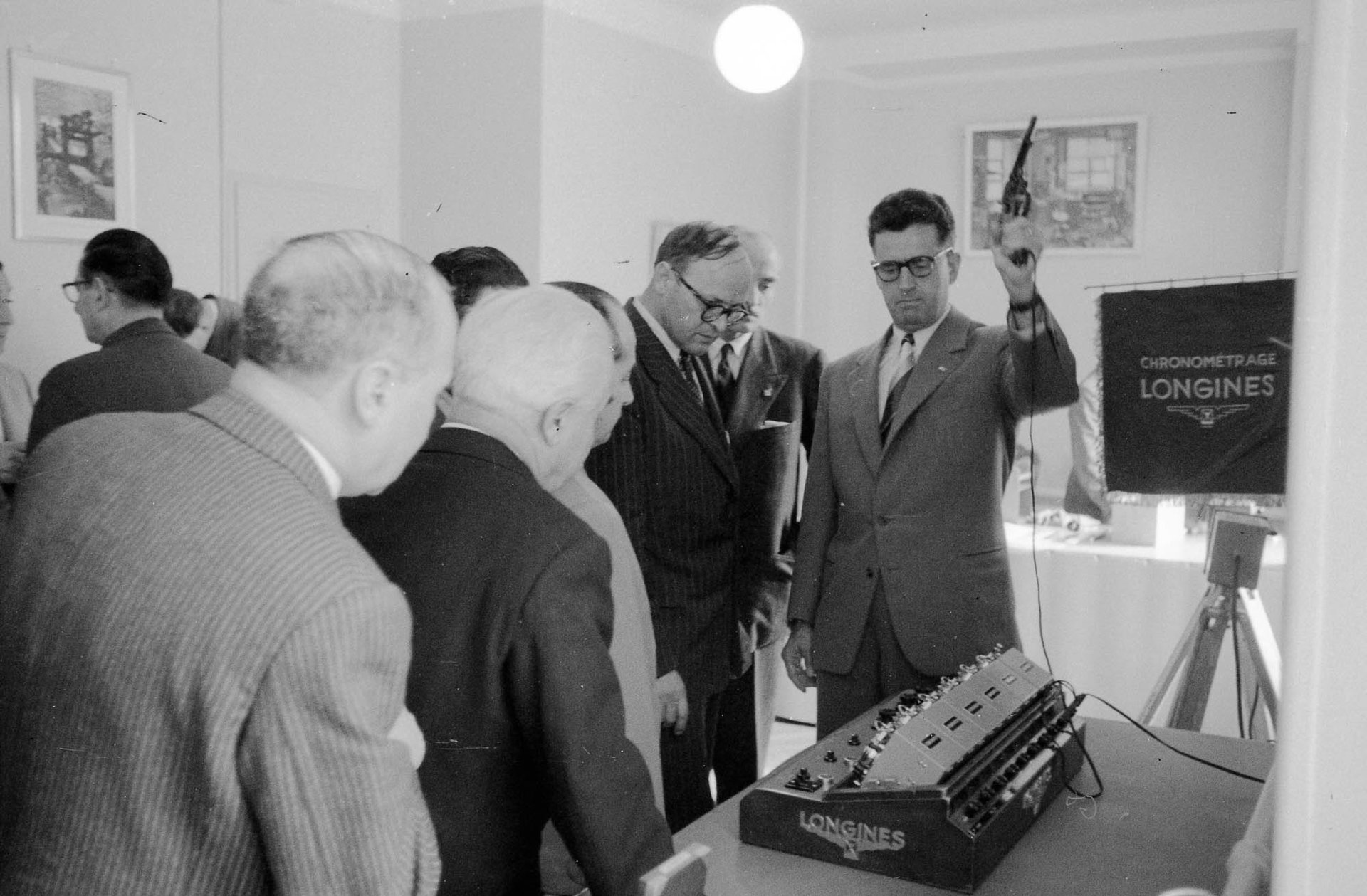 Ces trois photographies illustrent les débuts du chronométrage à quartz par l’entreprise Longines. Jusque dans les années 1970, les fédérations sportives hésitaient à se fier au chronométrage à quartz, préférant s’en remettre au chronométrage mécanique (en bas à gauche, 1954). L’image du haut, prise lors d’une compétition de ski dans les années 1950, permet de voir (posé sur une valise au premier plan) le Chronocinégines, premier appareil horloger portatif à atteindre la précision absolue (certifié à l’Observatoire de Neuchâtel en 1954). L’image en bas à droite a été prise à Saint-Imier lors de la conférence des représentants Longines (1961) à qui l’on fait une démonstration de chronométrage