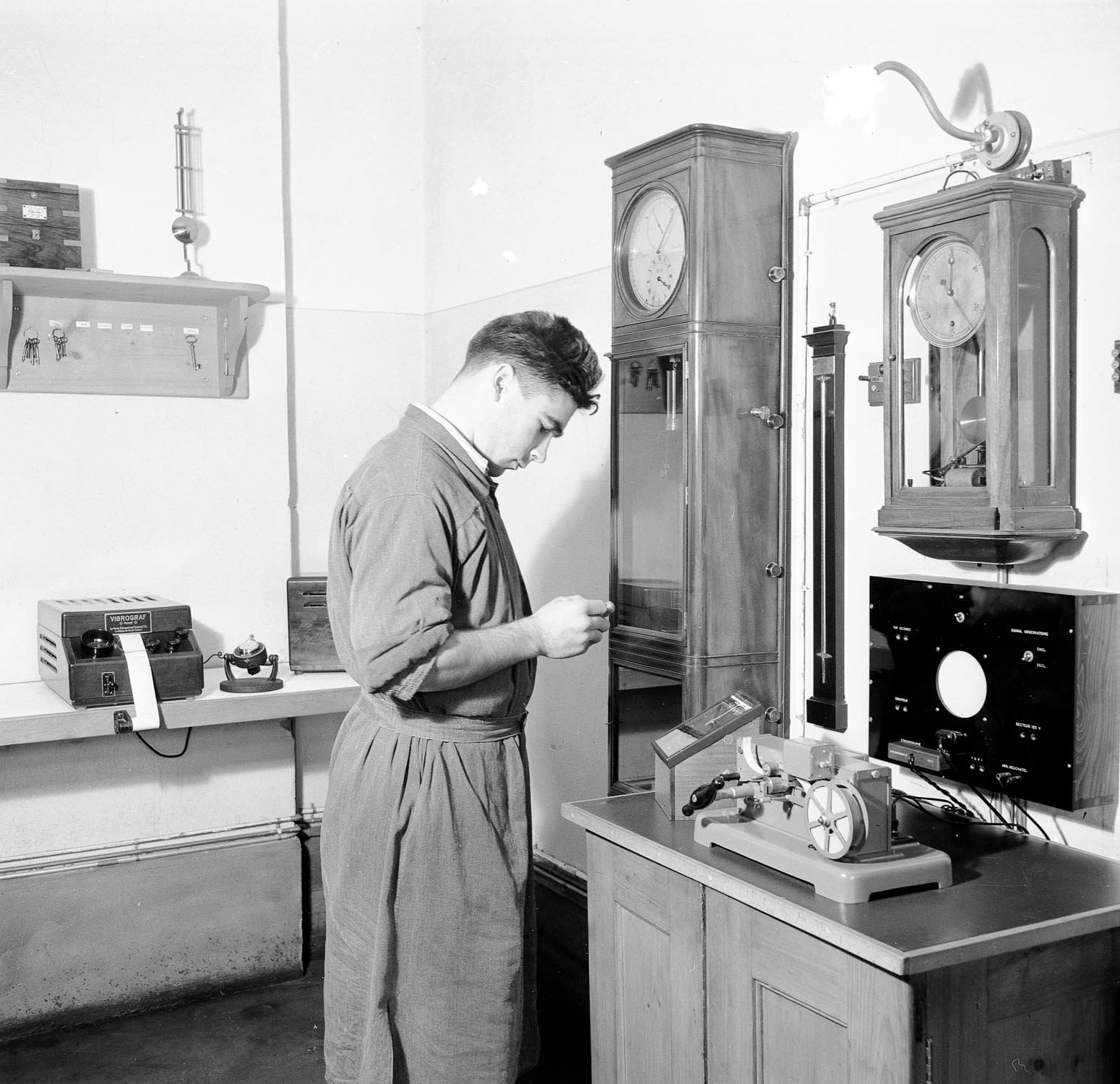 Image rare d’une horloge mère devant laquelle s’affaire un horloger dans les ateliers Ulysse Nardin (Le Locle, vers 1945). Dans la région neuchâteloise, c’est de l’Observatoire chronométrique de Neuchâtel (fondé en 1858) que l’heure exacte était délivrée aux entreprises par signal électrique à l’horloge mère dans les fabriques qui en étaient dotées. L’horloge mère fonctionnait comme un garde-temps et sa fonction première était d’envoyer des signaux afin de transmettre l’heure à d’autres horloges. Depuis 1967, l’heure exacte est définie par l’horloge atomique