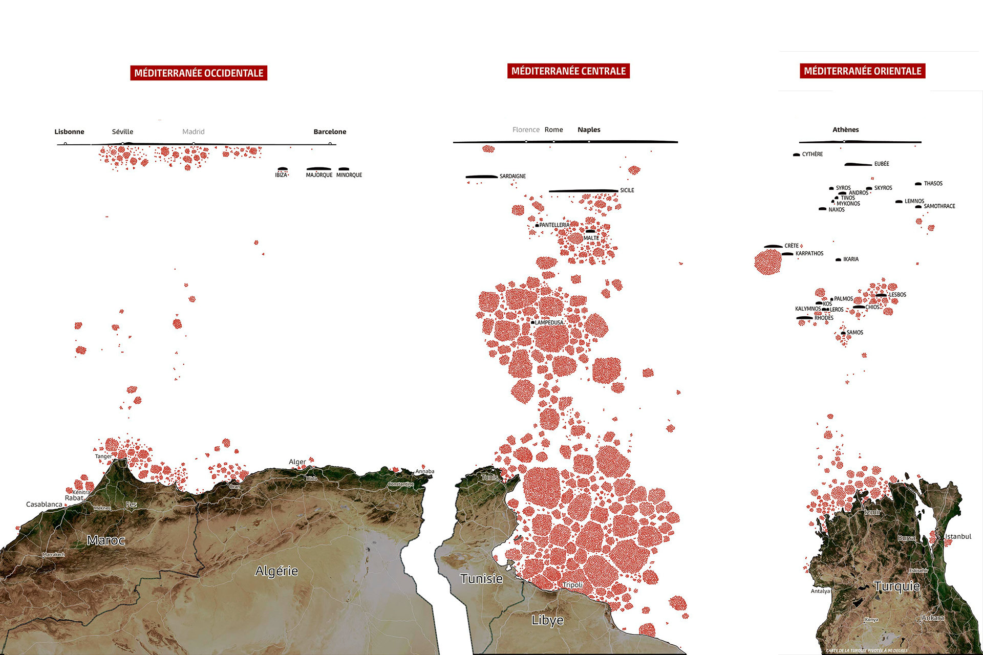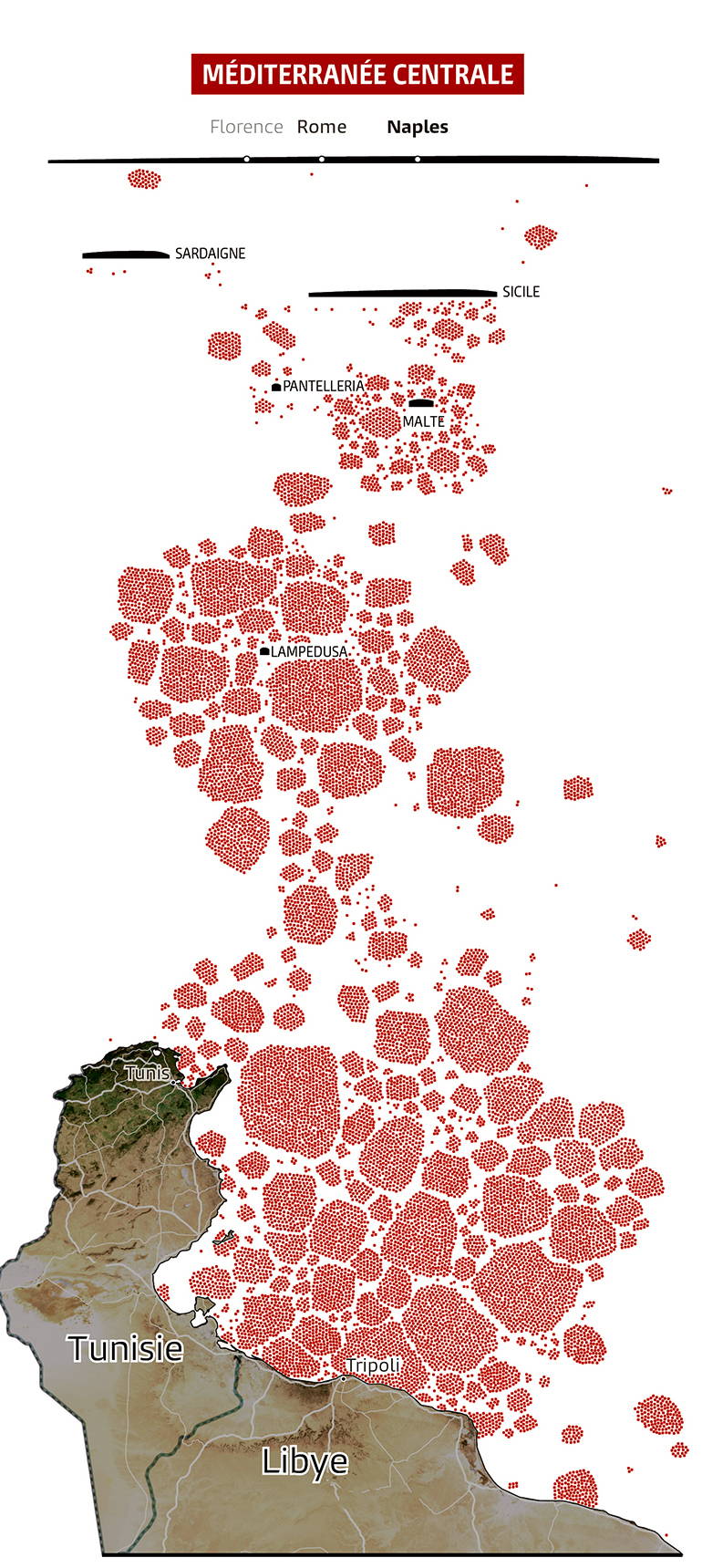 INFOGRAPHIE. La carte des morts en Méditerranée depuis 2005, par Levi Westerveld, publiée dans «Le Temps» en décembre 2017. Chaque point rouge représente un décès en mer.