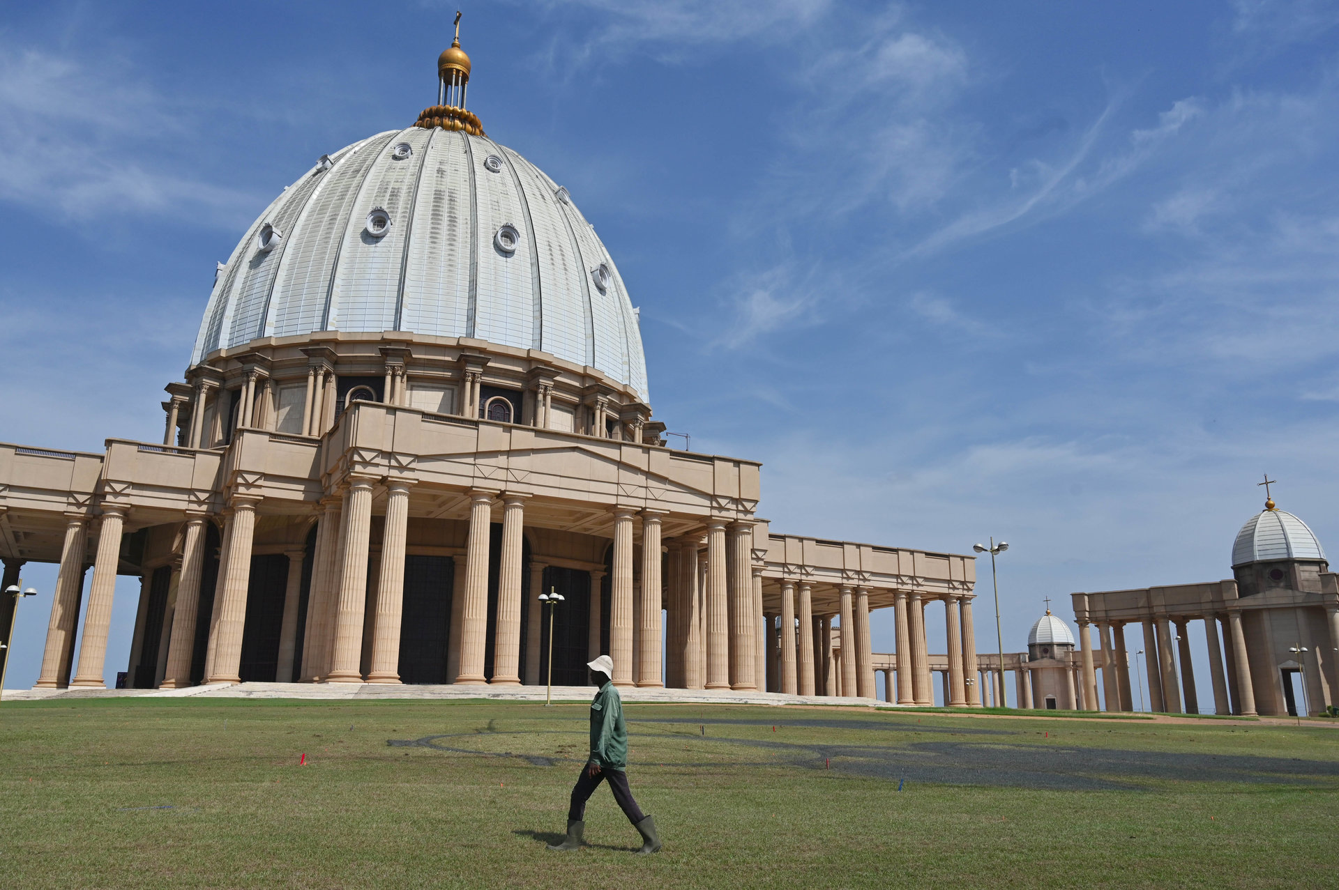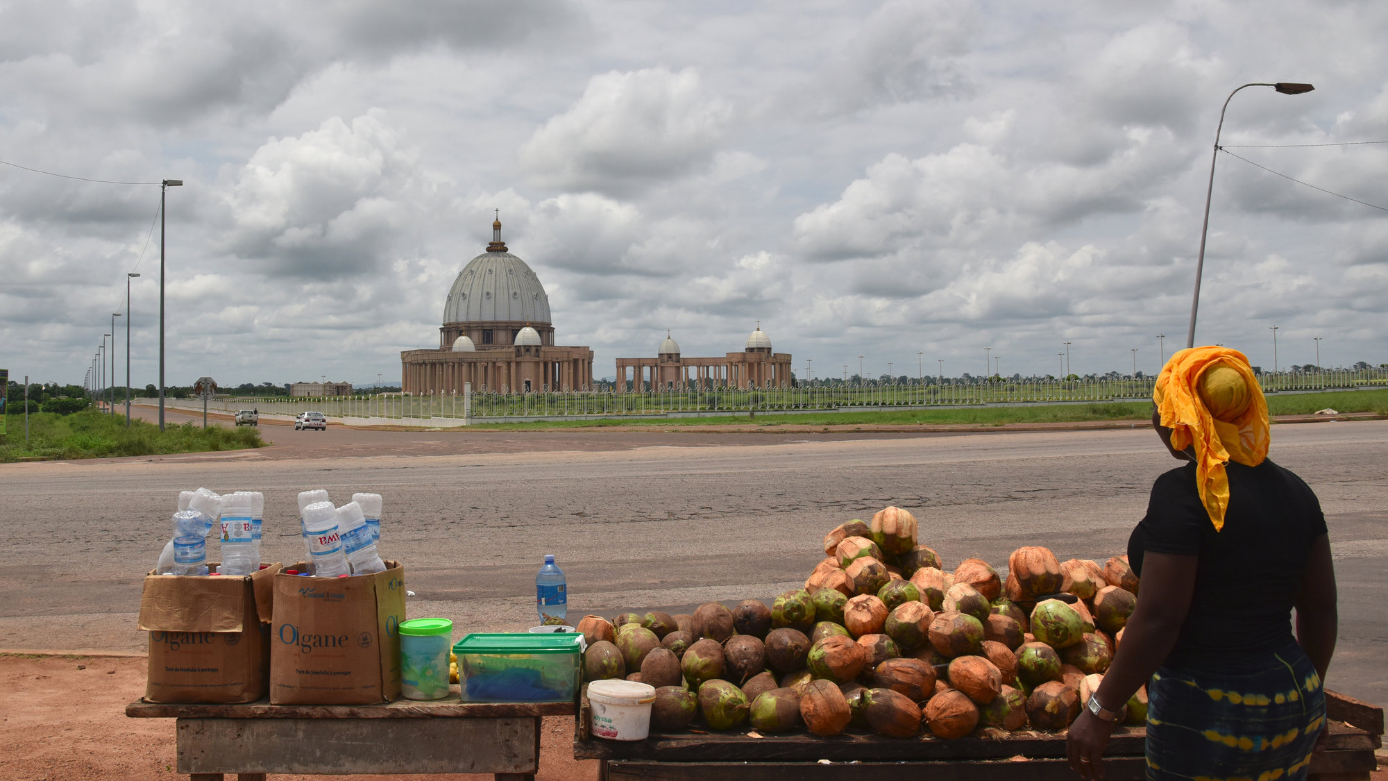 Yamoussoukro, capitale de la Côte d’Ivoire, à quelque 240 kilomètres d’Abidjan. Dans la brume du petit matin, la basilique Notre-Dame de la Paix émerge, majestueuse, les premiers rayons se reflètent sur son dôme. Un aspect carton-pâte, de décor de théâtre; mais un lieu saint bien réel, réplique de la basilique Saint-Pierre de Rome, fréquenté chaque année par des milliers de personnes.