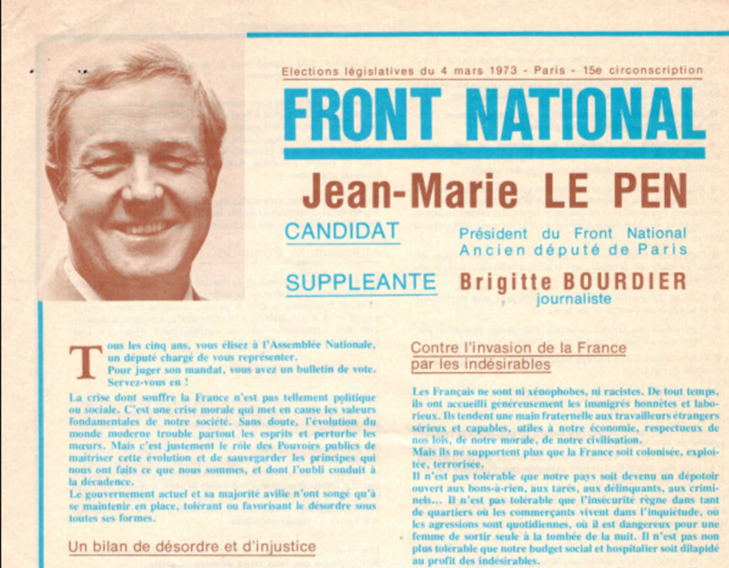 Le Front national connaît son premier rendez-vous électoral lors des élections législatives de 1973. Sur ses affiches de campagne, la formation politique imprime une flamme tricolore, symbole inspiré du MSI, un parti fasciste italien. Le mouvement enregistre une sévère défaite. Il n’attire que 108 000 voix, soit 0,52% des suffrages exprimés.