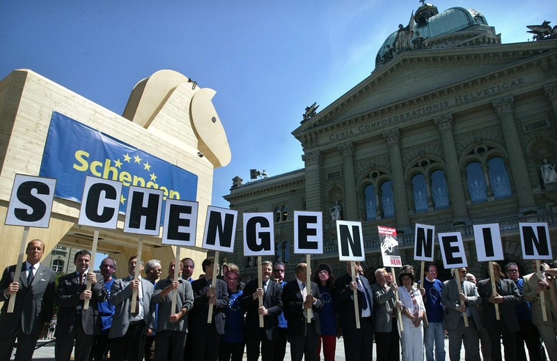 Action des anti-Schengen, Berne, printemps 2005. Lire cette interview de Samuel Schmid sur ses doutes passésL’évolution de l’intégration dans l’Union elle-même conduit à la nécessité de négocier de nouveaux accords. Le point sensible réside dans les dispositions dites de Schengen/Dublin. Pour le Conseil fédéral, la Suisse doit être intégrée à l’espace Schengen, c’est une question de compétitivité autant que de commodité – presque de symbole, pour le pays du coeur de l’Europe. La coopération en matière d’asile s’impose aussi, du point de vue suisse.