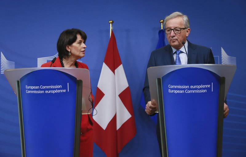 Doris Leuthard et Jean-Claude Juncker, Bruxelles, 6 avril 2017. Berne et Bruxelles sur la voie du dégelDébut 2017, l'ambiance est morose sur le plan interne helvétique – les partis bourgeois, même le PLR fervent partisan des bilatérales, ont dit ne plus croire à un accord global.